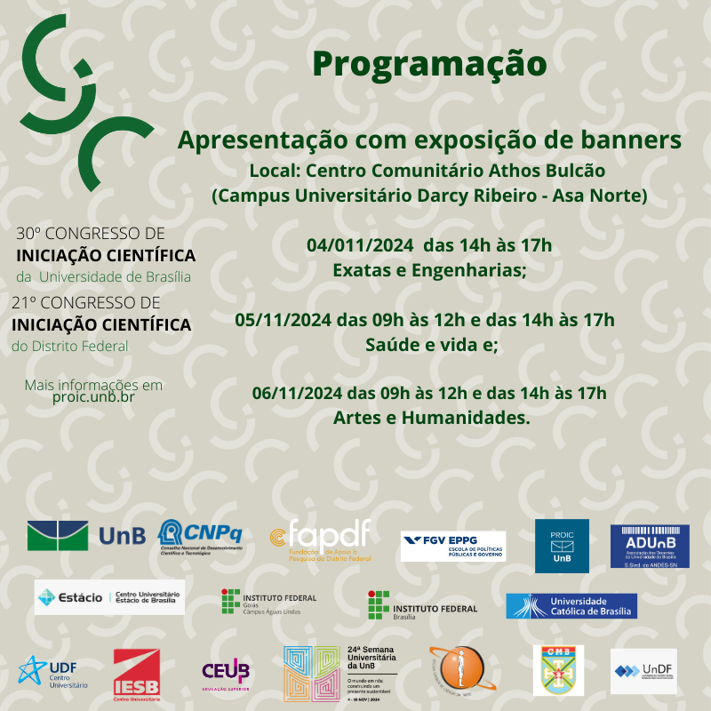 As apresentações do 30º Congresso de Iniciação Científica da UnB e 21º Congresso de Iniciação Científica do DF ocorreram no Centro Comunitário Athos Bulcão, nos dias 04 a 06 de novembro.