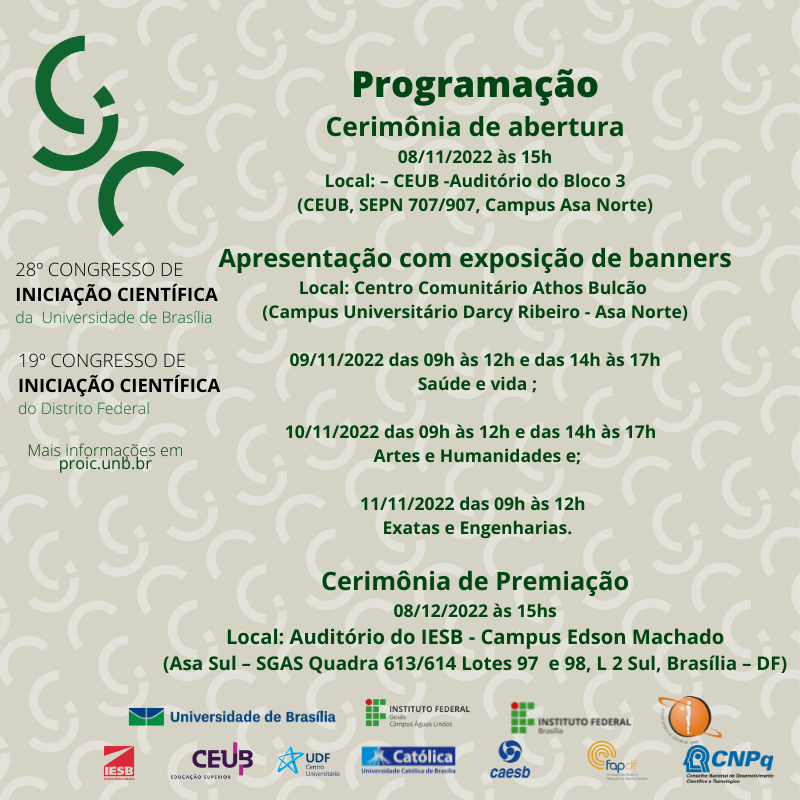 As apresentações no 28º Congresso de Iniciação Científica da UnB e 19º Congresso de Iniciação Científica do DF ocorreram de forma mista: apresentação virtual na plataforma SGCIC e apresentação presencial no Centro Comunitário Athos Bulcão.